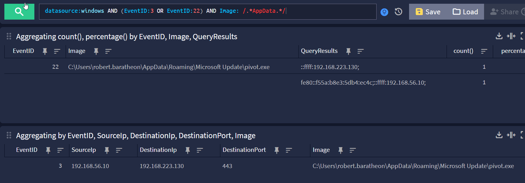 Correlacionar IPs internos que geram tráfego externo suspeito com processos em pastas anômalas detectados pelo Sysmon.