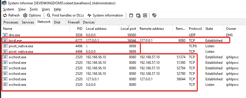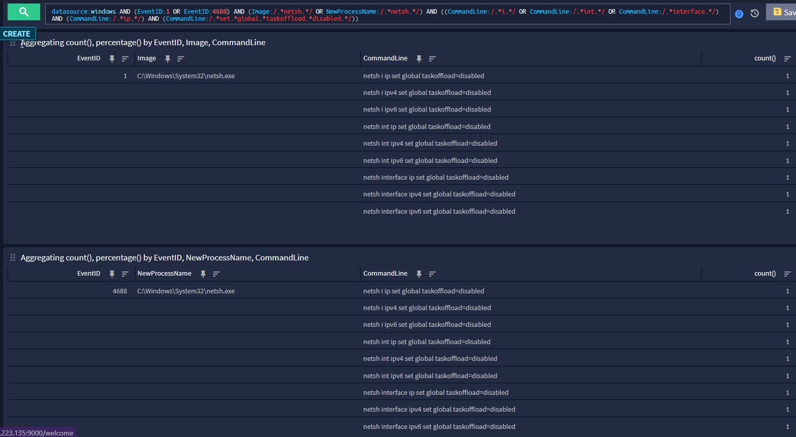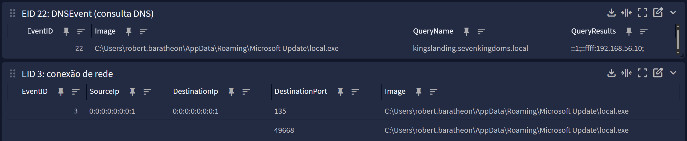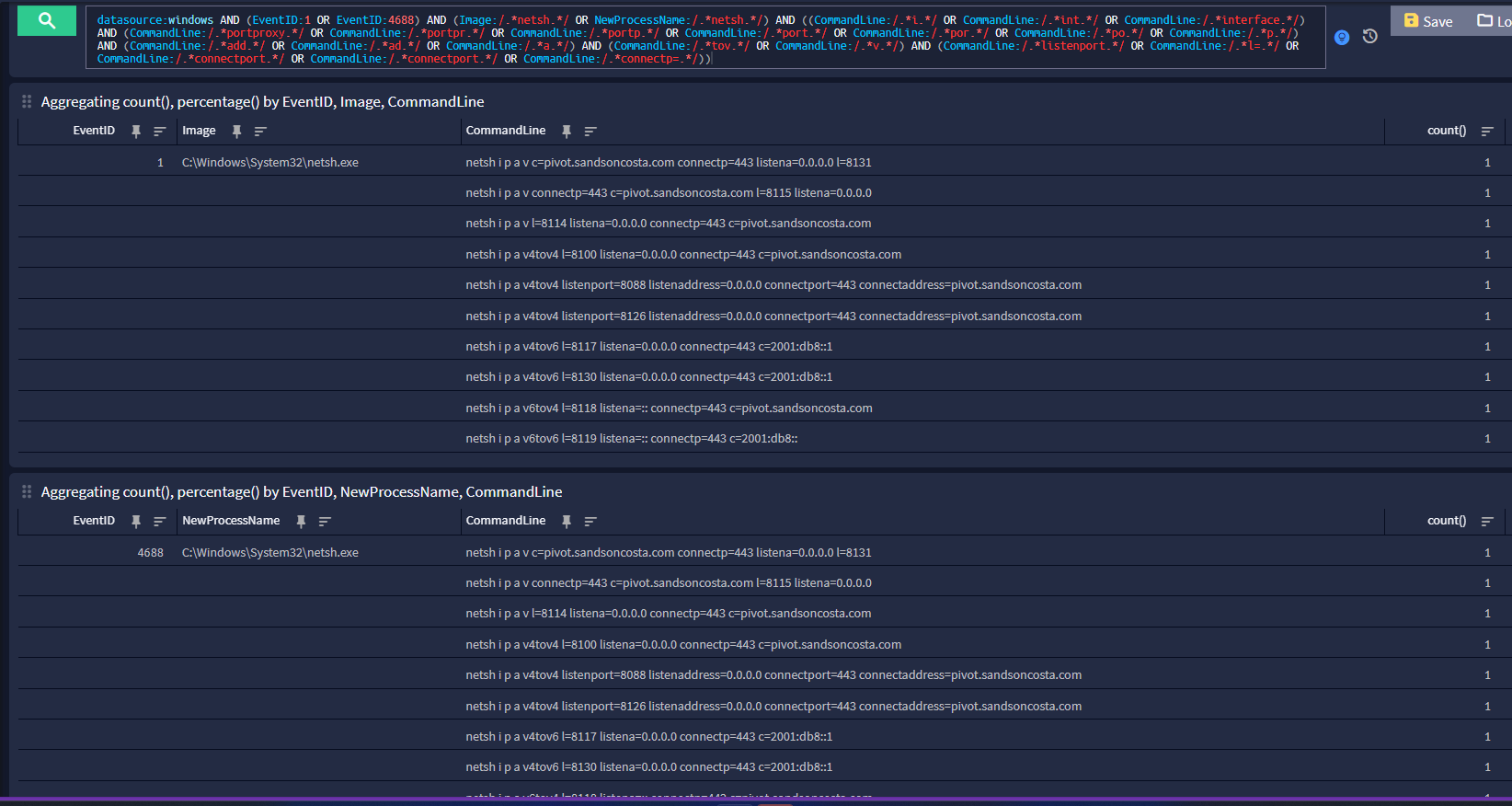 - Redirecionamento via netsh portproxy em nível de kernel → não aparece no Sysmon Event ID 3 (conexão real some)